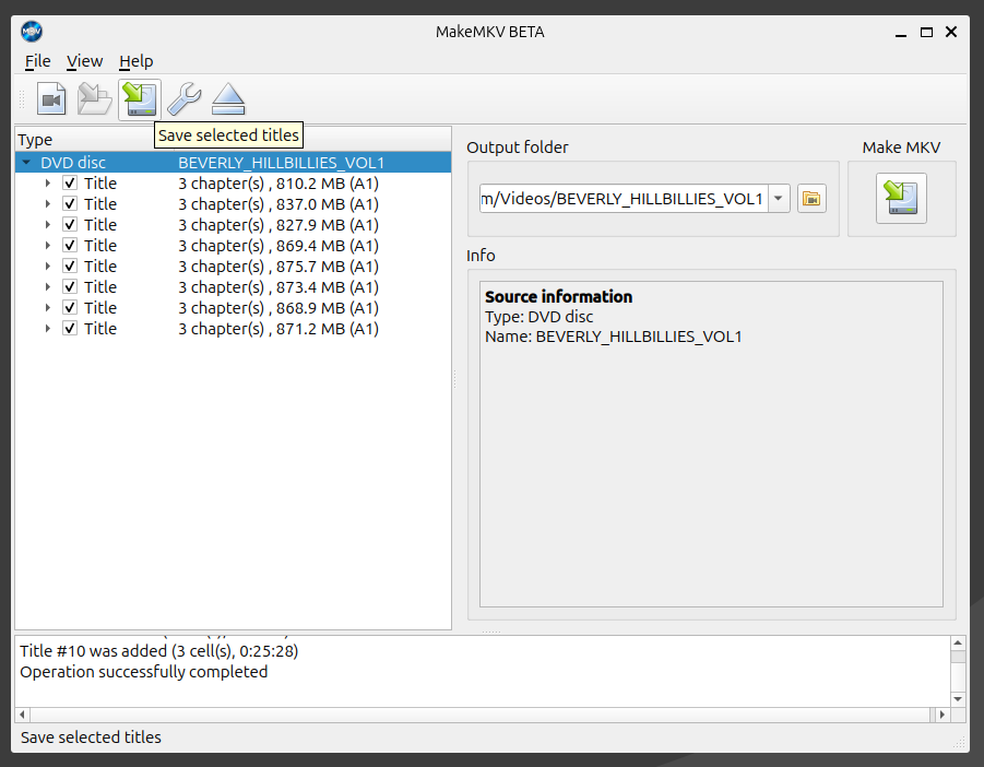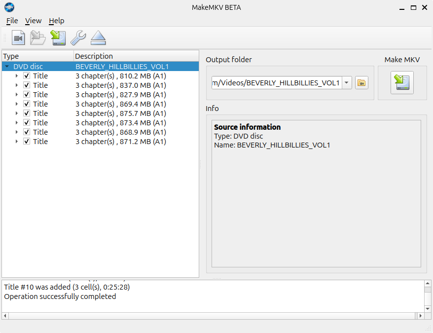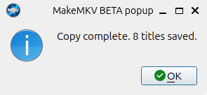 You will be asked whether you wish to create a directory beneath the Videos directory to hold the output files. Click on Yes. When the process is completed, you will see a window indicating the number of titles saved, which will correspond to the number of MKV files saved in the output directory.