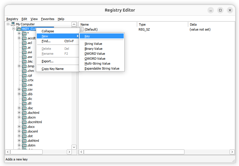 entry, right-click on HKEY_CLASSES_ROOT and choose New.
