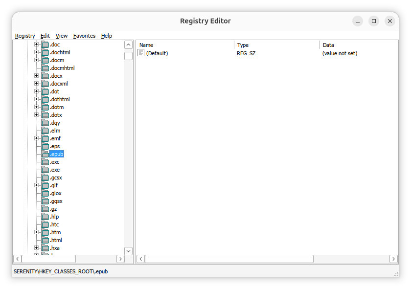 HKEY_CLASSES_ROOT\.epub and set