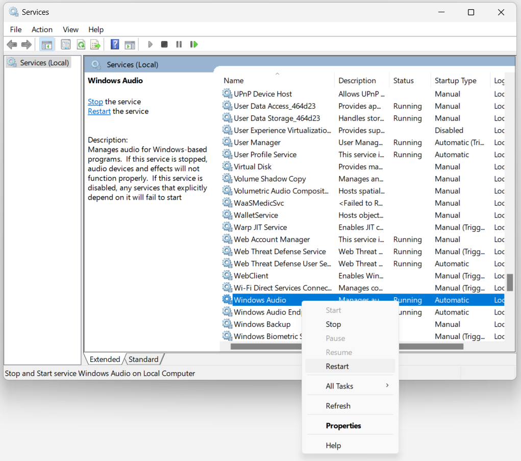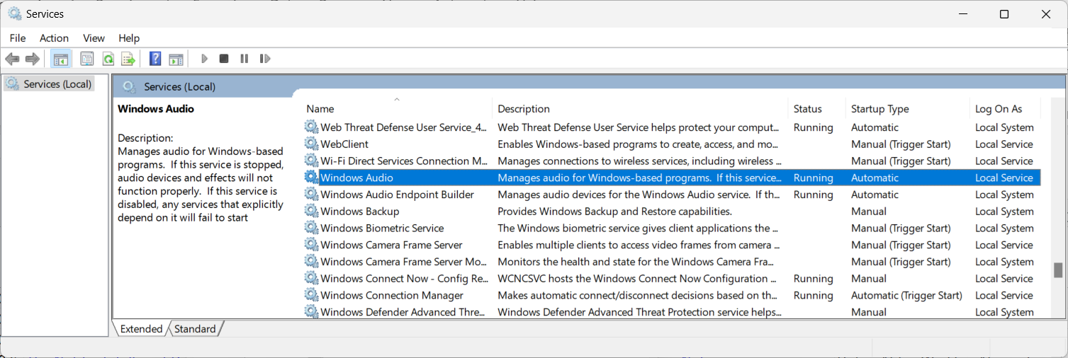 When the Services window opens, scroll down until you see Windows Audio.
