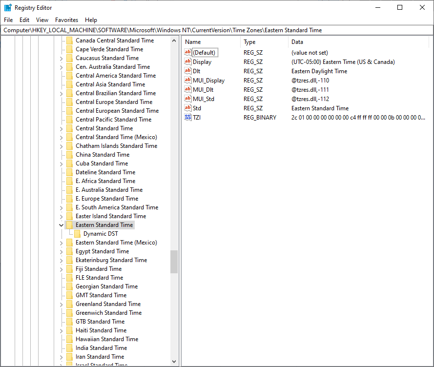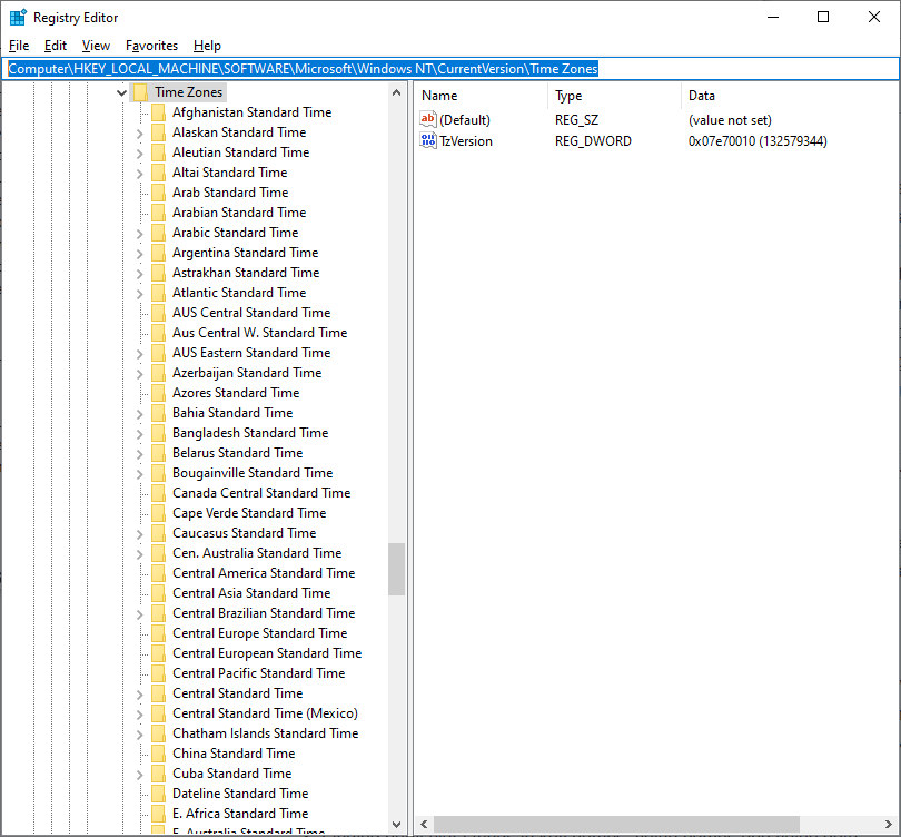 NT\CurrentVersion\Time Zones — you can view the list with the